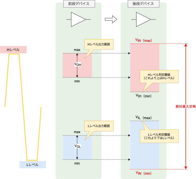 - 前段デバイスがハイレベルを出力したとき、後段デバイスが確実にハイレベルと認識できるようにするため、前段デバイスのハイレベル出力電圧(VoH)の最小値が、後段デバイスのハイレベル判定閾値(VIH)の最小値を上回ること。