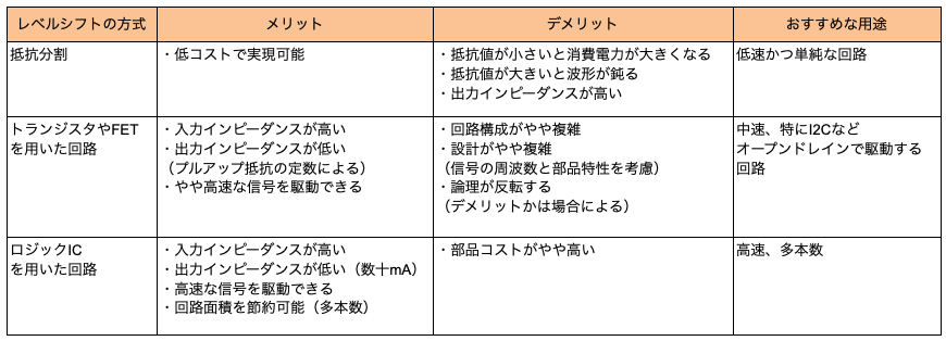 紹介した『抵抗分割』の方式、『トランジスタやFETを用いた回路』の方式、『ロジックICを用いた回路』の方式について、メリット、デメリット、おすすめな用途をまとめます!