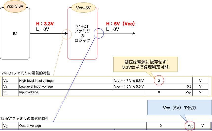 つまり、74HCTシリーズは5V電源で動作(出力電圧は5V)しながら、3.3Vの入力信号を論理判定できるため、レベルシフトが成り立ちます。