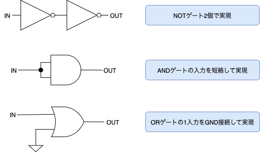ただ、1信号だけレベルシフトしたいのにもったいない、という場合には、別回路の余ったゲートや1ゲート、2ゲート入りのロジックICを使用する手もあります。